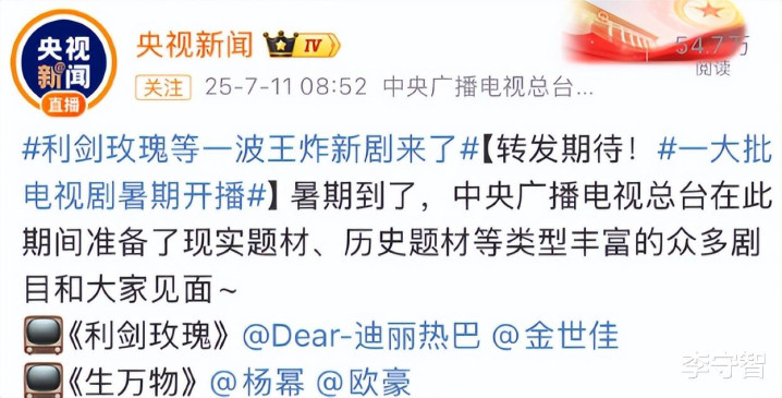 倒是央视预告了暑期档要开播的两部新剧,有点话题。倒不是说多期待是好剧,只是迪丽热巴和杨幂两大流量美女偶遇了,一边是迪丽热巴和金世佳合作的《利剑玫瑰》,一边是杨幂欧豪合作的《生万物》。